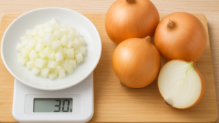 レシピに「玉ねぎ30グラム」と書かれていると、「実際にどのくらいの量?」と悩む方は多いのではないでしょうか。玉ねぎはサイズによって重さが大きく異なり、同じ1/4カットでも種類によって30gになったり50gになったりします。この記事では、玉ね...